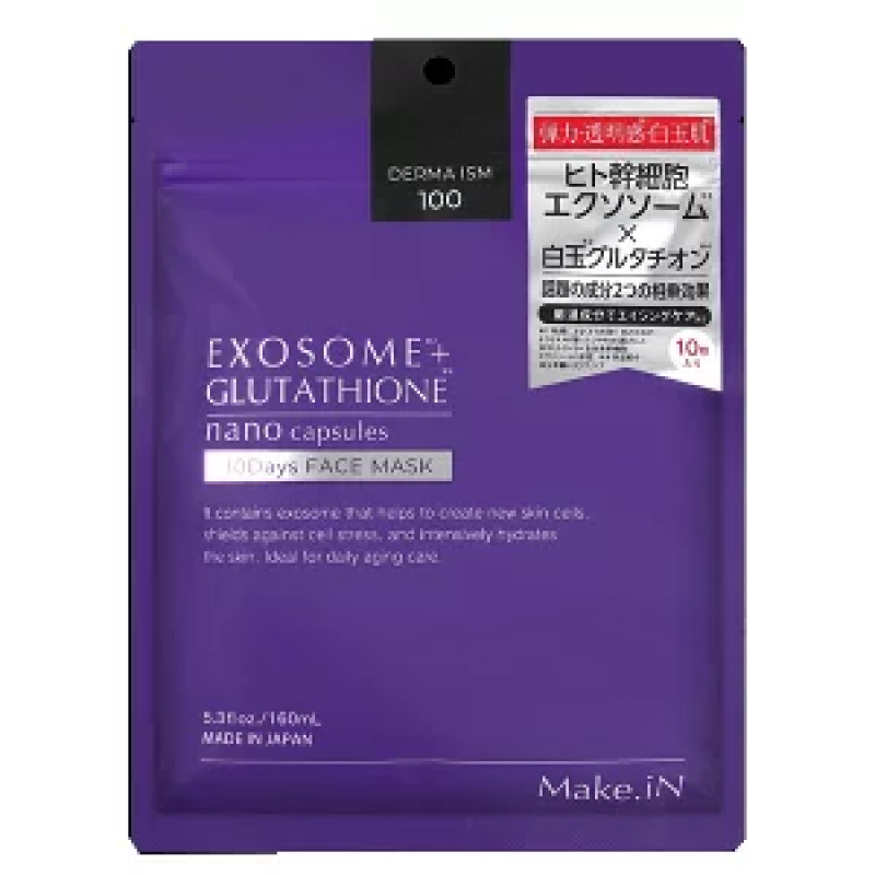 Омолаживающая маска для лица MAKE.IN DERMA IZM 100 EXOSOME + GLUTATHIONE nano-capsules содержит экзосомы стволовых клеток человека и глутатион - способствует обновлению кожного покрова, улучшению состояния и барьерных функций кожи, профилактике образования морщин, обвисания и излишней пигментации кожи.
